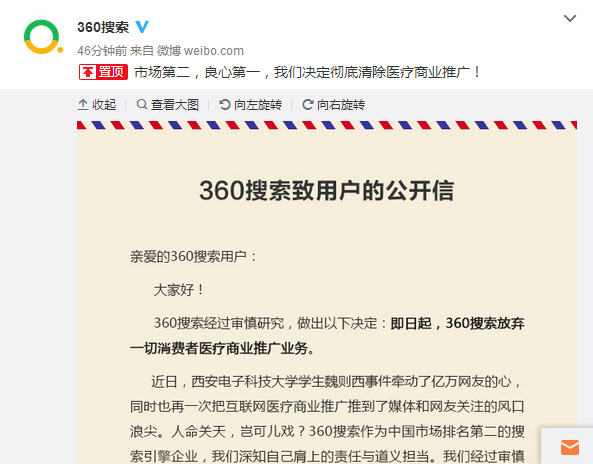 2016年5月3日,360搜索作为中国第二大搜索引擎企业,正式向广大用户发布了一封公开信。信中宣布:即日起,360搜索彻底清除医疗广告业务,下线所有的消费者医疗商业推广,并承诺向广大网民提供安全、干净、可信赖的搜索服务。