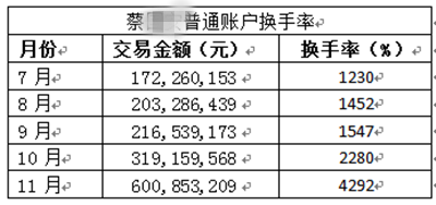 在代客理财结束后,蔡先生通过查询股票账户的交易明细,发现何先生非法代客理财的数月,该股票账户交易异常,持续恶意对倒,频繁交易,涉及的股票有汤臣倍健、欧菲光、宝利国际,尤其是物产中大,不到5个月时间累计交易2611笔,涉及交易金额13.39亿元,交易明细显示每天大量买进卖出,尤其是2015年10月和11月,月度换手率更是高达2280%和4290%。基于上述异常情况,蔡先生怀疑存在涉嫌坐庄,利用他本人账户倒仓接盘。