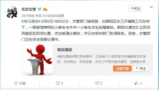 #情况通报# 6月8日18时02分,交管部门接报警,在朝阳区东三环辅路三元东桥下,一辆使馆牌照的小客车与本市一小客车发生剐蹭事故。朝阳交通支队立即派民警赶赴现场处置,依法受理此事故,并已与相关部门取得联系。目前,交管部门正在依法调查处理中。