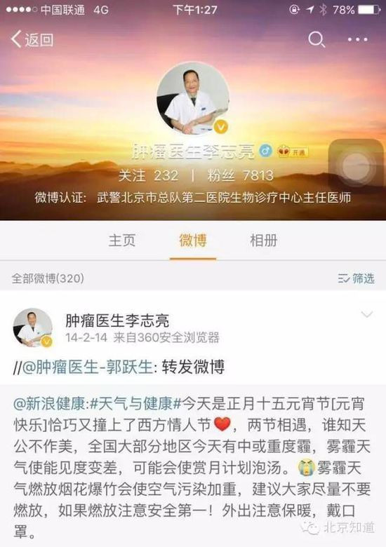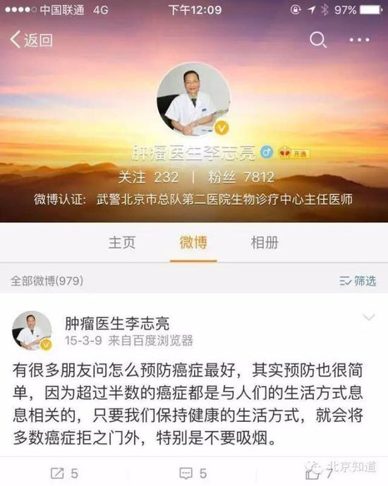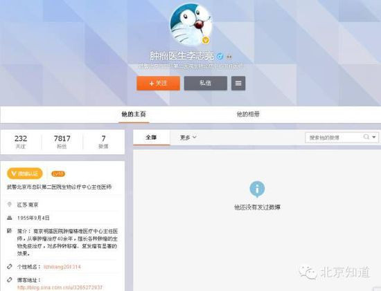 同时发现,微博认证为“武警北京市总队第二医院生物诊疗中心主任医师”的账号“肿瘤医生李志亮”,从今日11时许开始删除自己的微博。