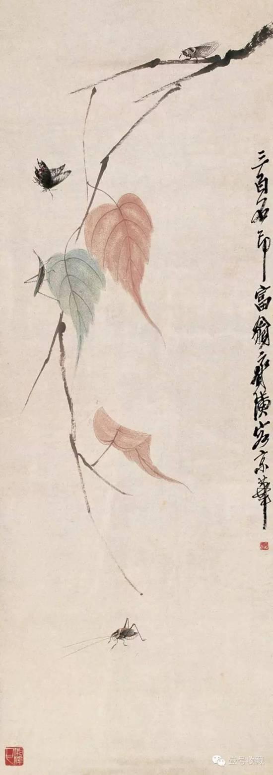 《枫叶鸣蝉图》齐白石花鸟画的草虫是齐白石绘画创作中不可缺的重要部分及闪亮点,也是其创作中最具特色,最为成功的部分。如他的意笔鸟、虫、虾、蟹、蛙、蝌蚪、鼠等,而工笔中则以蝉、蜻蜓、蚱蜢、蜜蜂、甲虫、蝴蝶著称。而画蝉则又是这其中最突出拿手的。